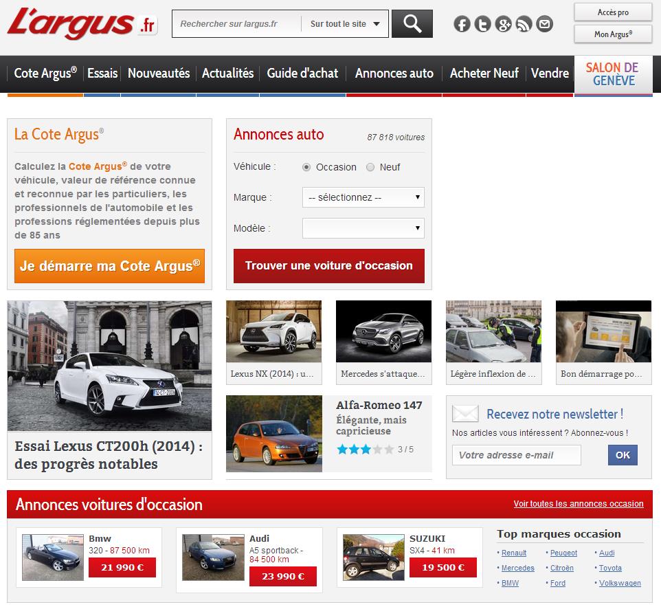largus.fr est la référence française en matière de transactions de véhicules d’occasion et propose, outre la »cote officielle », un ensemble de services destinés aux professionnels et aux particuliers (la recherche et la publication de petites annonces, le calcul du coût des réparations, les prix et les fiches techniques des véhicules neufs, l’actualité automobile sous la forme d’essais, de comparatifs, de nouveautés ainsi que tous les conseils pour réaliser sa transaction…) sur ses différents supports digitaux.